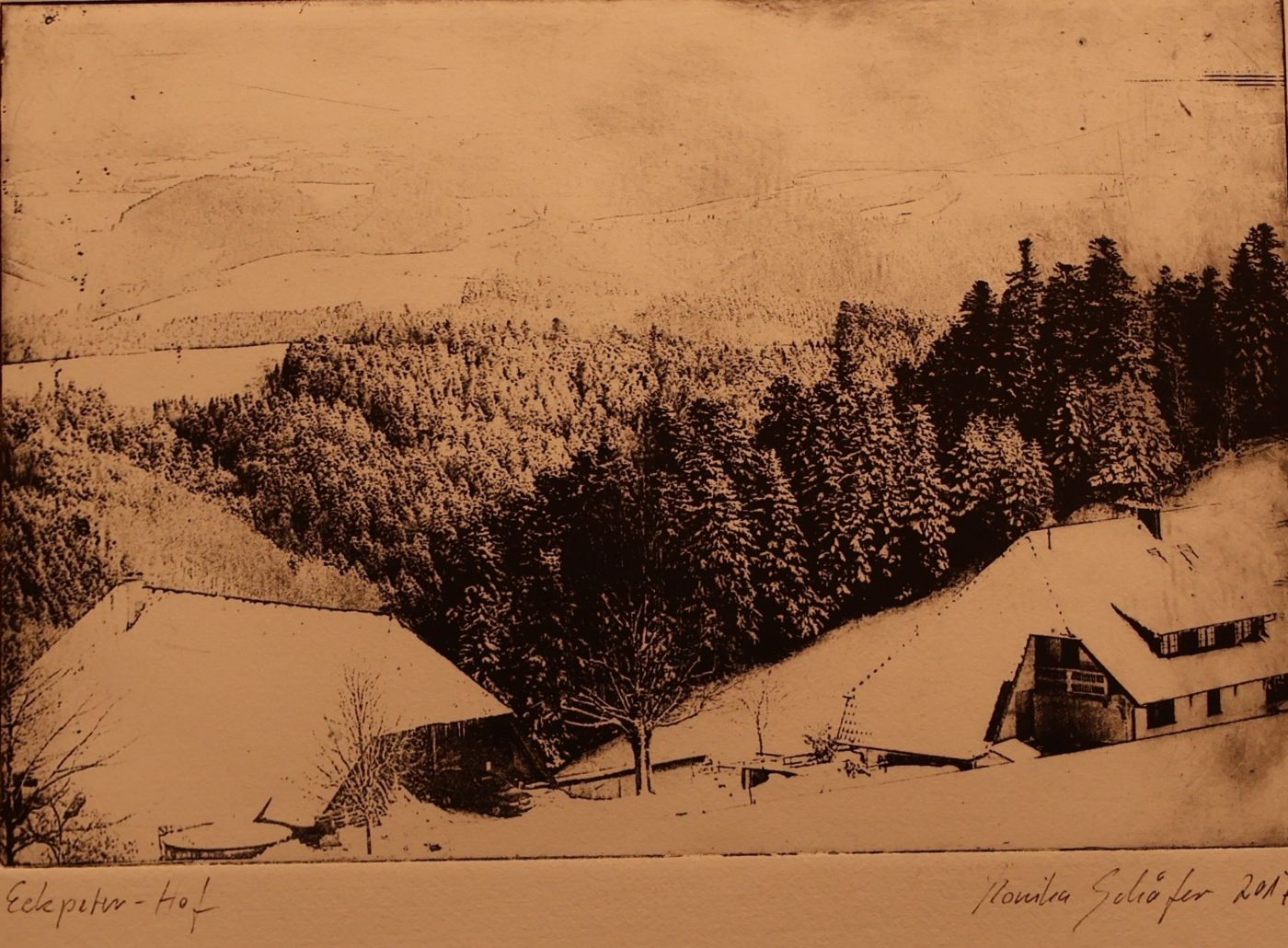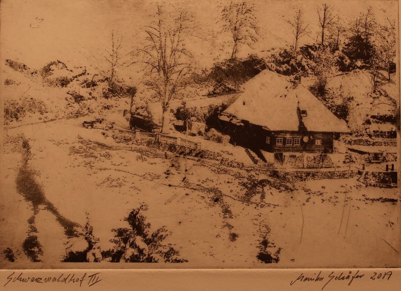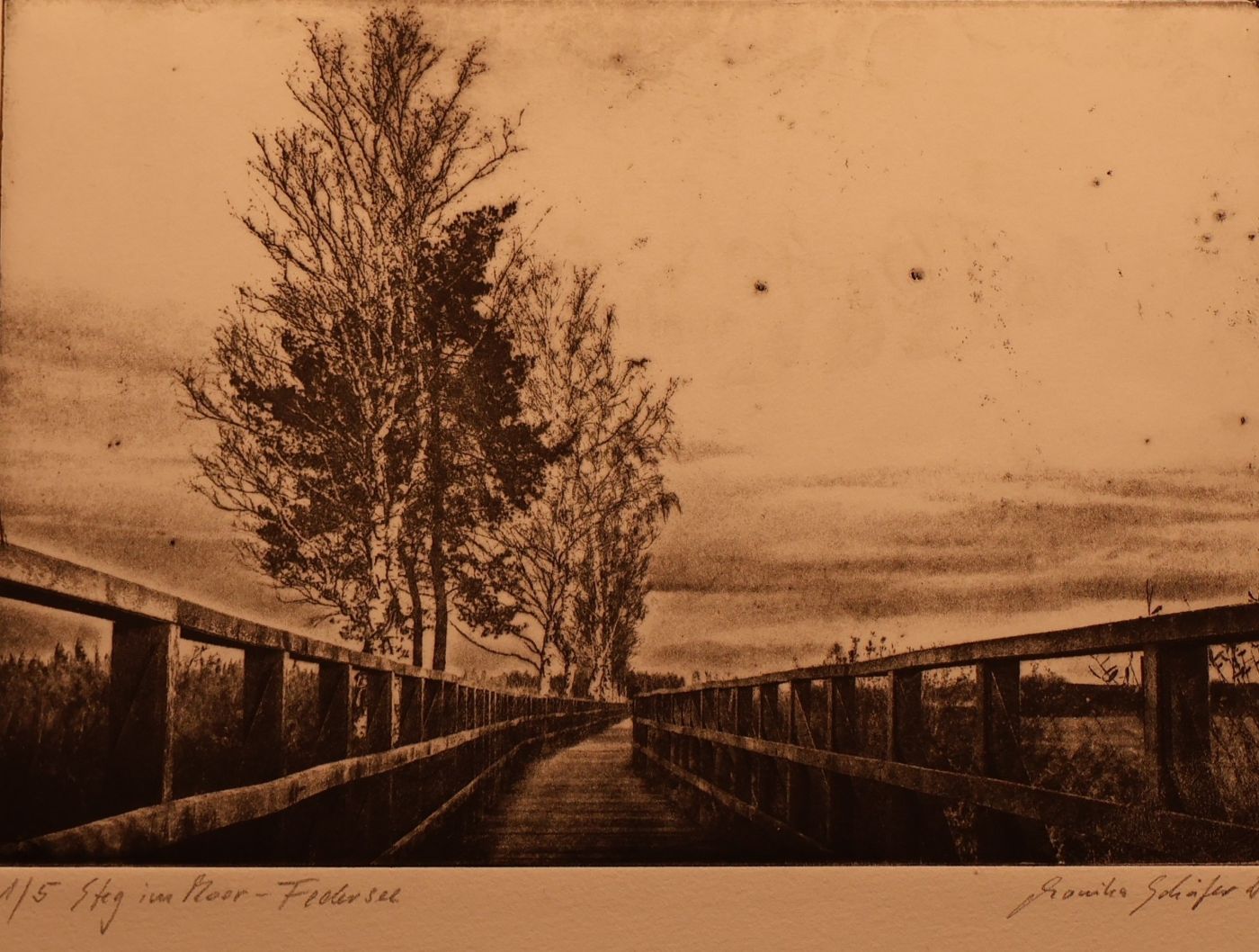 Seit 2007 befasst sich Monika Schäfer intensiv mit einem besonderen fotografischen Edeldruckverfahren, der Intagliotypie. Das Wort ist abgeleitet vom Italienischen intagliare – einritzen. Dabei handelt es sich um ein Tiefdruckverfahren, das in jedem Prozessschritt ohne gesundheitsgefährdende Stoffe auskommt. Es ermöglicht Monika Schäfer, auf der Grundlage digital erstellter Landschafts- und Naturfotografien künstlerische Drucke herzustellen, die eine ganz eigene Anmutung haben. Dies entspricht ihrem Wunsch nach einer Verbindung von digitalem Workflow und handwerklichem Tun und gleichzeitig bietet es ihr Möglichkeiten für kreative Experimente.