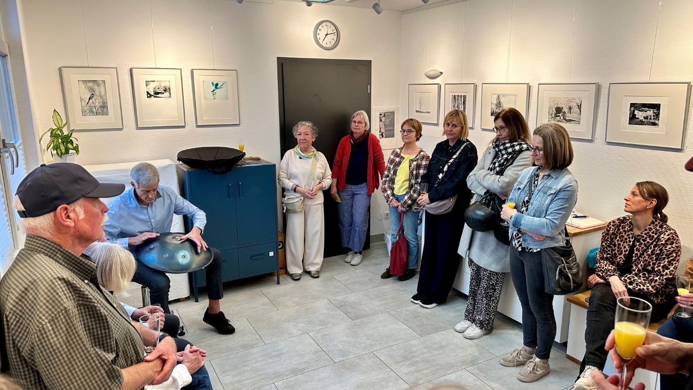 … unserer Clubkameradin Monika Schäfer am 17. April 2026 in der Galerie KleinFormat unserer Clubkameradin Angela Bettinger https://angela-bettinger.de/ . Roland Zipfel „Ziro“ begleitete die Veranstaltung musikalisch auf seinem Hang. Die Ausstellung endet am 10. Mai 2026.